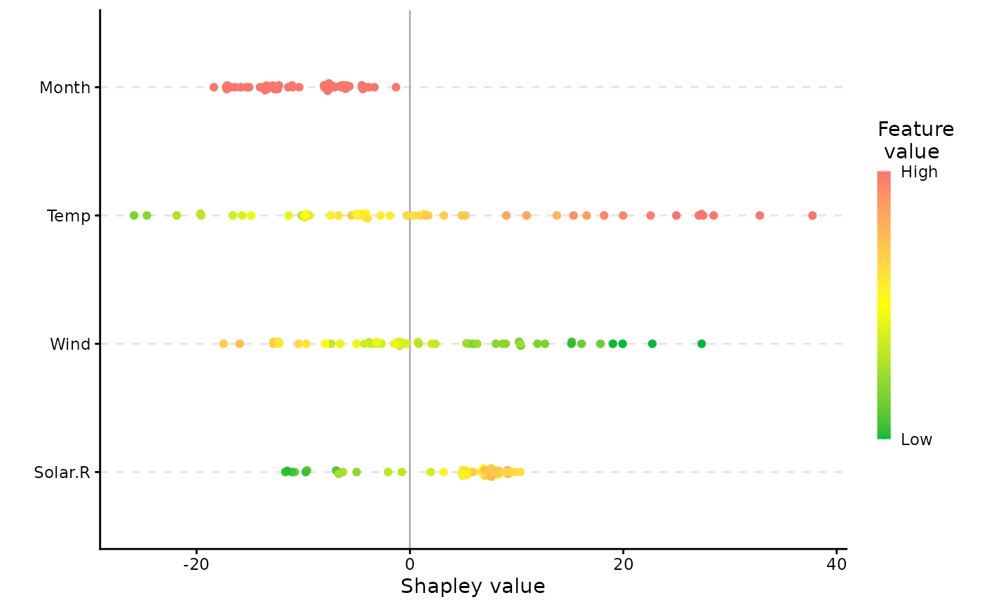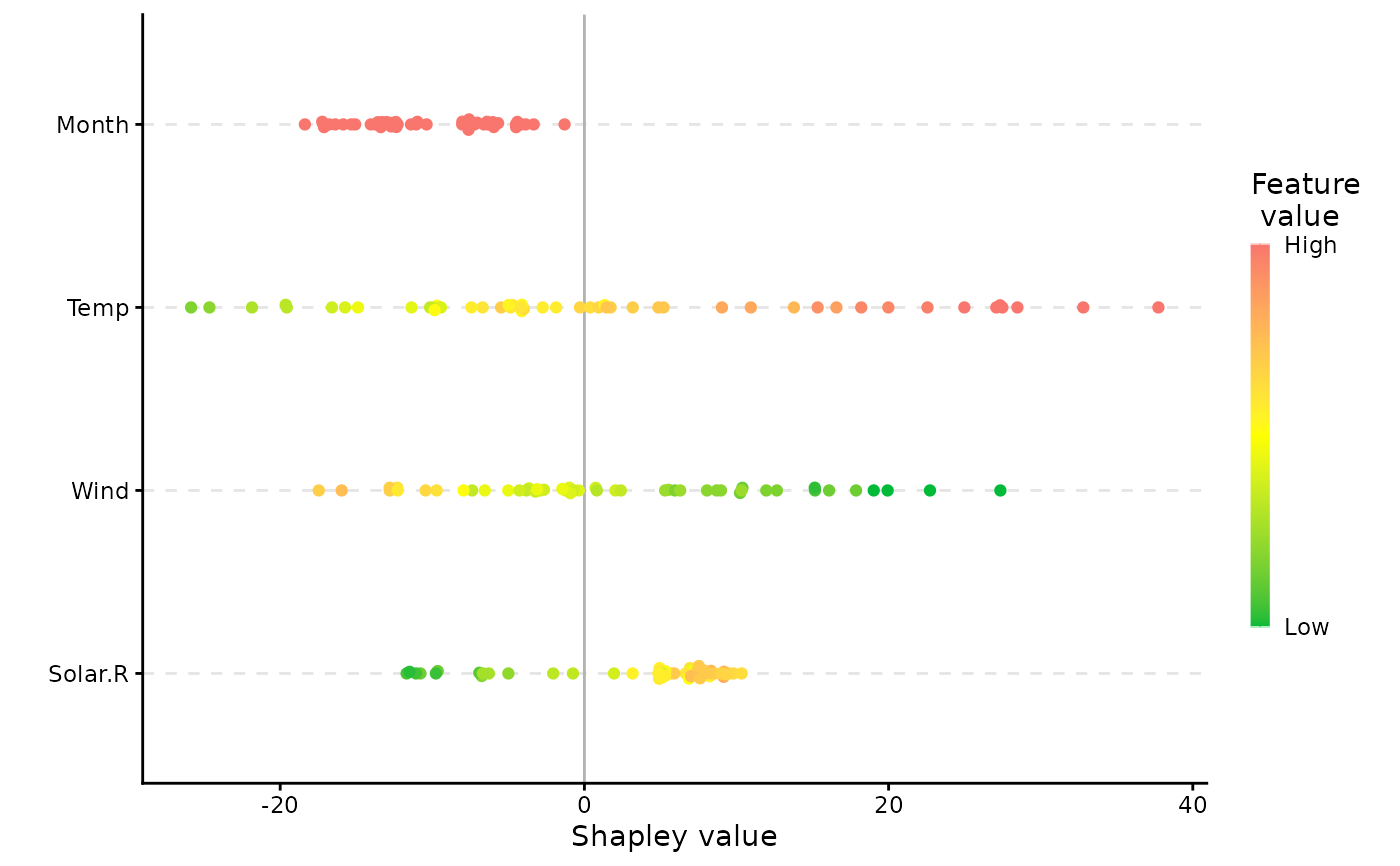 ggplot2::ggplot()) for positive and negative Shapley values, respectively. The default iscol=NULL, plotting with the default colors respective to the plot type. Forplot_type = "bar"andplot_type = "waterfall", the default isc("#00BA38","#F8766D"). Forplot_type = "beeswarm", the default isc("#F8766D","yellow","#00BA38"). Forplot_type = "scatter", the default is"#619CFF".If you want to alter the colors in the plot, the length of the