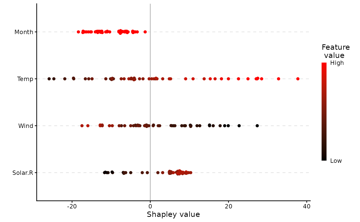 colvector depends on plot type. Forplot_type = "bar"orplot_type = "waterfall", two colors should be provided, first for positive and then for negative Shapley values. Forplot_type = "beeswarm", either two or three colors can be given. If two colors are given, then the first color determines the color that points with high feature values will have, and the second determines the color of points with low feature values. If three colors are given, then the first colors high feature values, the second colors mid-range feature values, and the third colors low feature values. For instance,col = c("red", "yellow", "blue")will make high values red, mid-range values yellow, and low values blue. Forplot_type = "scatter", a single color is to be given, which determines the color of the points on the scatter plot.- bar_plot_phi0